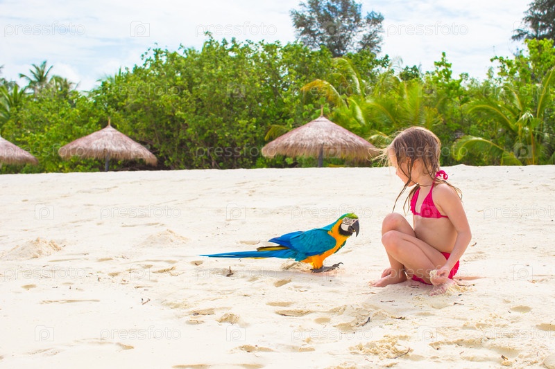 Девочка играет с попугаем на пляже