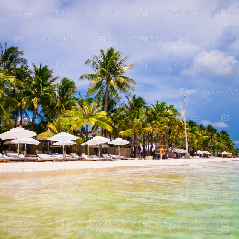 Шезлонги и зонтики на тропическом пляже