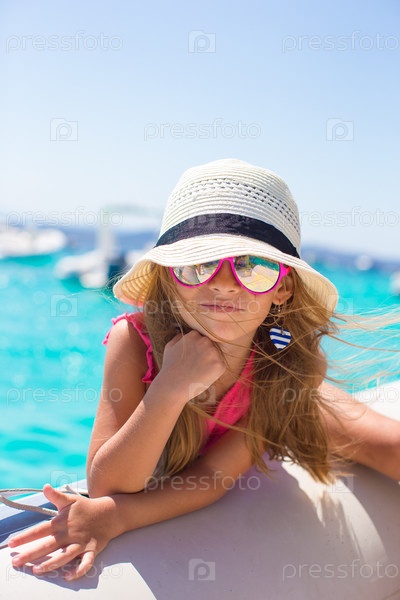 Милая девочка, наслаждаясь плаванием на лодке в открытом море