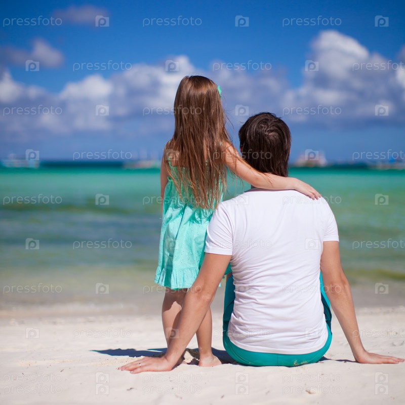Очаровательная маленькая девушка и молодой папа на тропическом пляже