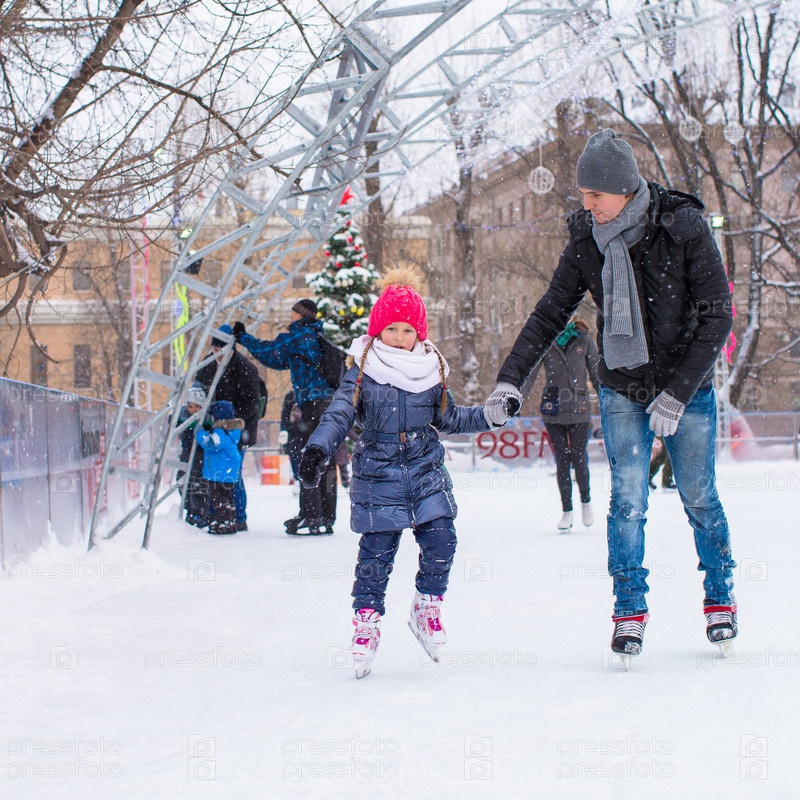 Очаровательная маленькая девочка и счастливый отец на открытом катке