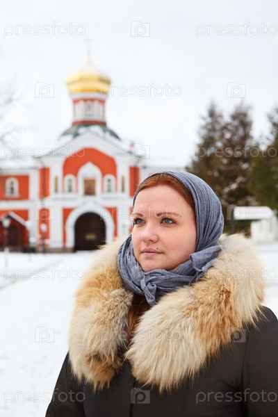 Женщина в платке и зимней одежде у монастыря