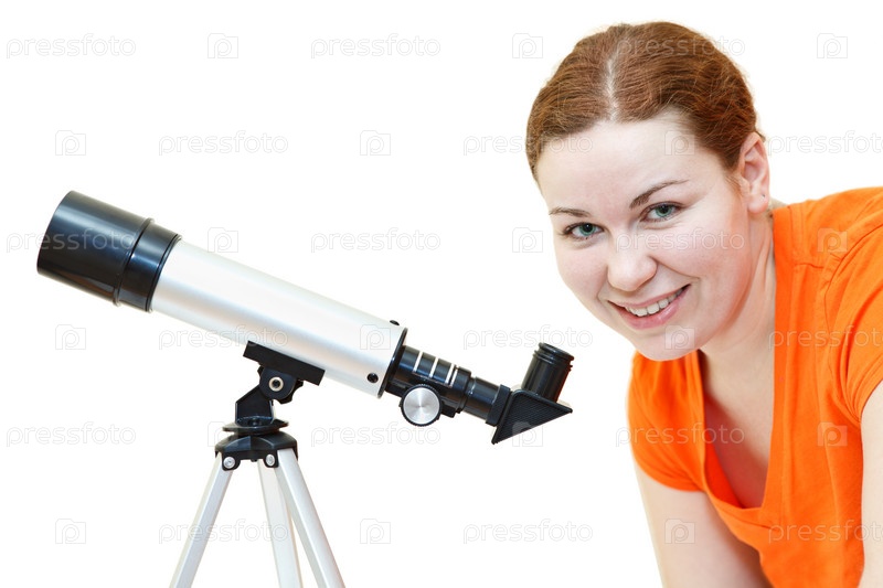Молодая женщина в оранжевой футболке смотрит в телескоп на белом фоне