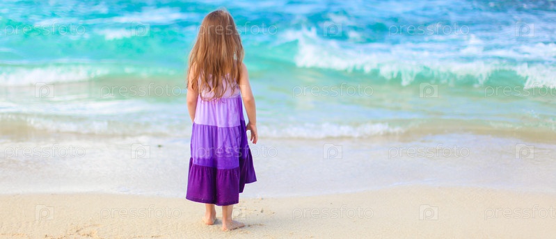 Маленькая девочка на тропическом пляже с водой бирюзового океана