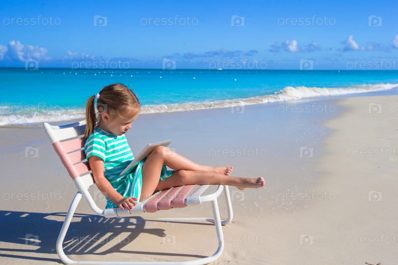 Очаровательная девочка с ноутбуком на пляже во время летних каникул