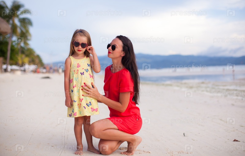 Молодая мать и ее маленькая дочь на пляже