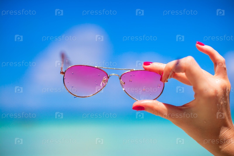 Красочные розовые очки на тропическом пляже