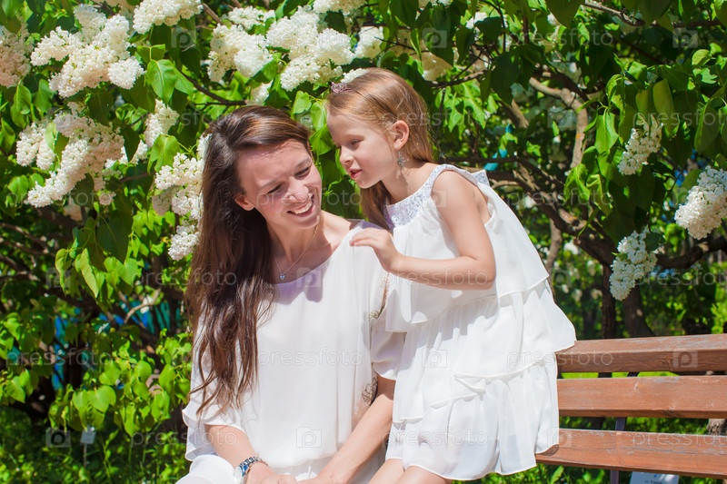 Маленькая девочка с ее матерью в цветущем саду