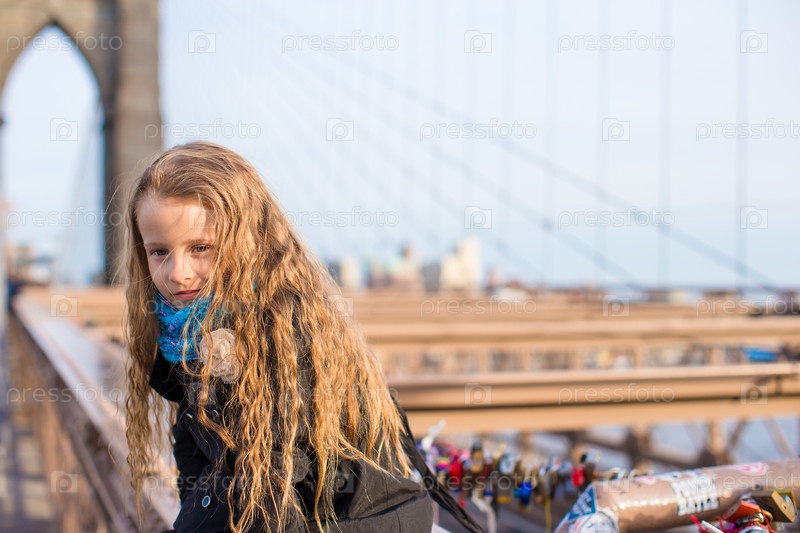 Очаровательная маленькая девочка сидит на Бруклинском мосту
