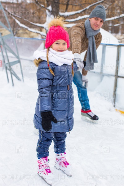 Отец с дочкой катаются на коньках
