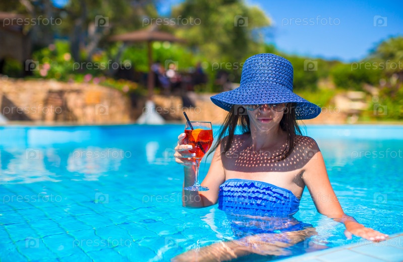 Красивая молодая женщина расслабляется в бассейне с коктейлем