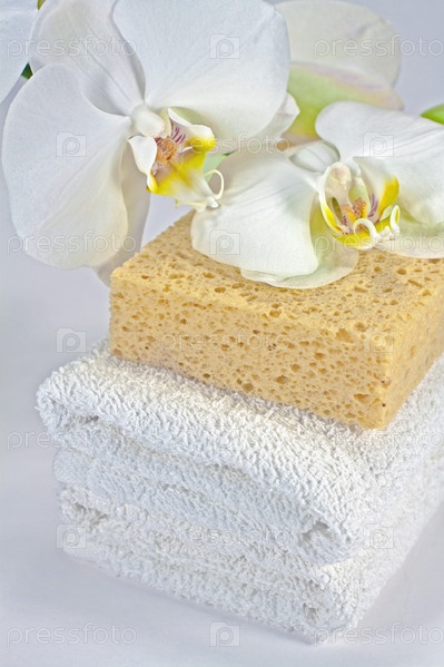 Губка, полотенца и цветок крупным планом