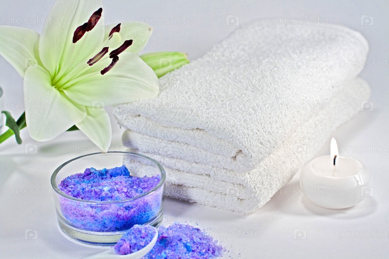 Морская соль, полотенца, цветок и свеча крупным планом