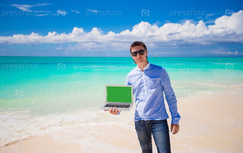 Молодой человек с ноутбуком на пляже
