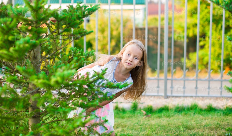 Маленькая девочка выглядывает из-за елки