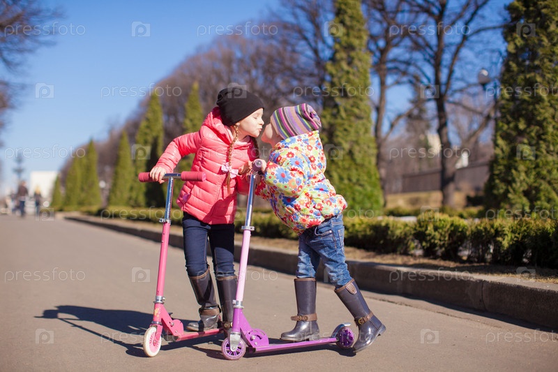 Маленькие девочки катаются на самокатах