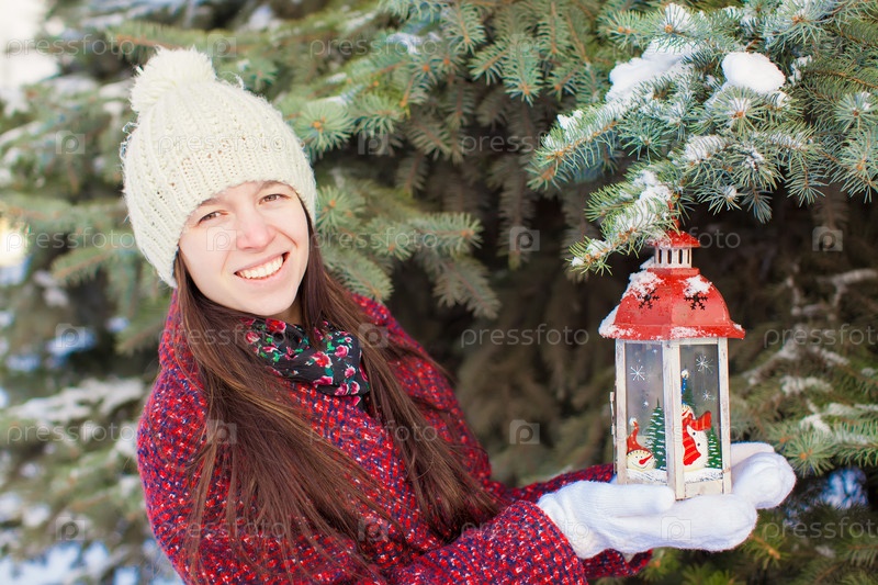 Молодая красивая женщина с рождественским фонариком