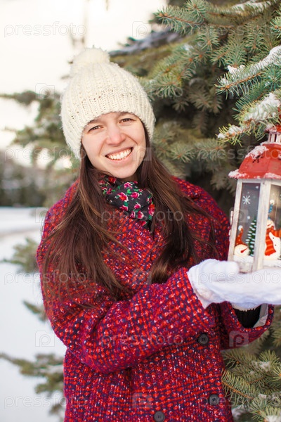 Молодая красивая женщина с рождественским фонариком