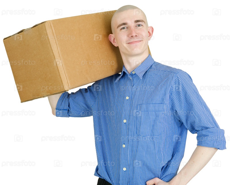 Человек с картонной коробкой на белом фоне