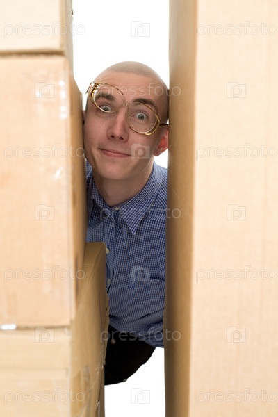 Мужское лицо зажимается между картонными коробками на белом