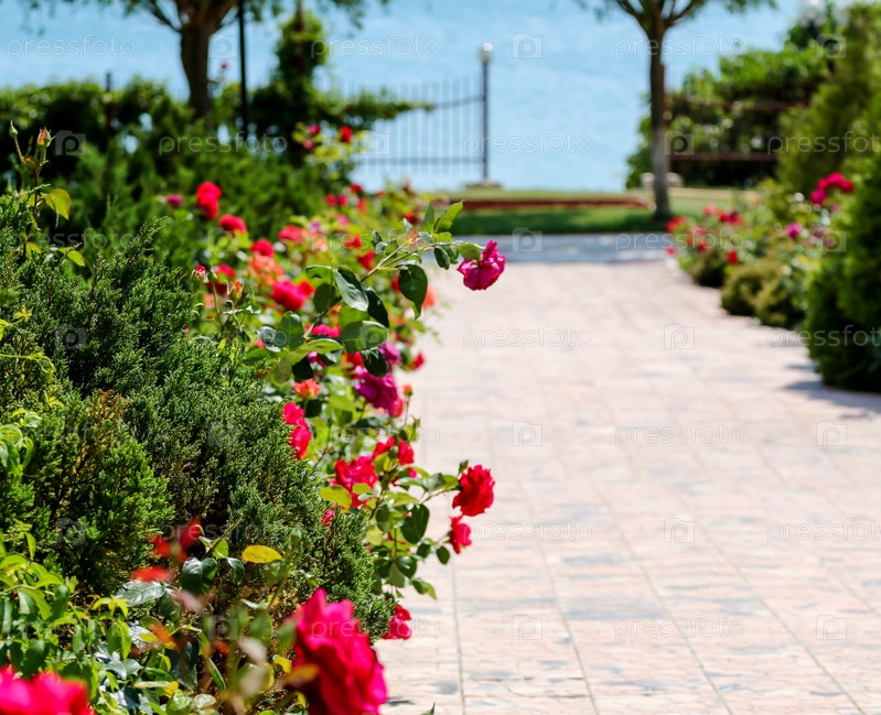 Красивая цветочная аллея на берегу моря