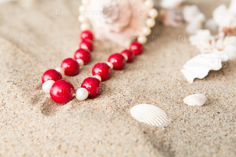 Ракушки и ожерелье на песке