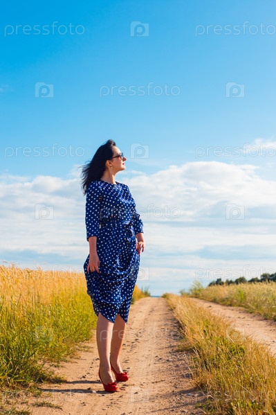 Красивая брюнетка в поле пшеницы
