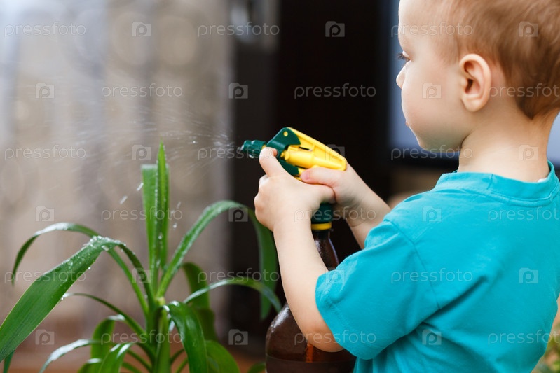 Мальчик ухаживает за комнатными растениями