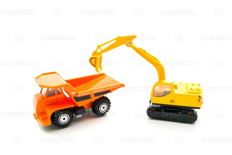 Грузовик оранжевый и желтый экскаватор