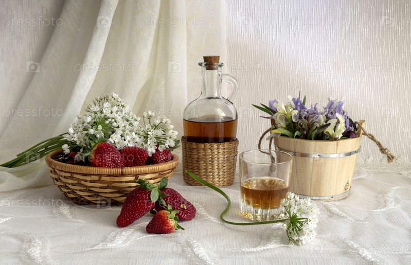 Натюрморт с коньяком, клубникой и дикими ирисами
