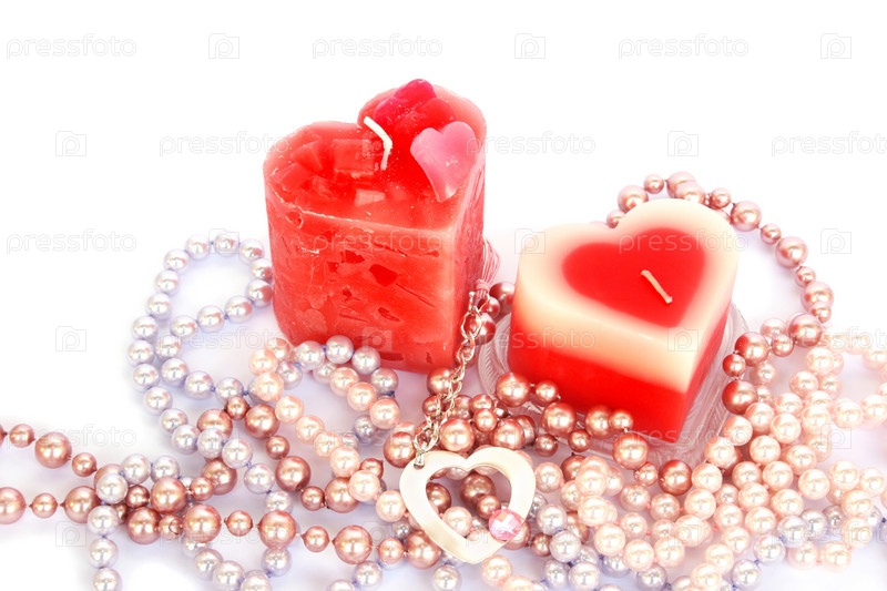 Свечи в форме сердца и жемчуг на белом фоне