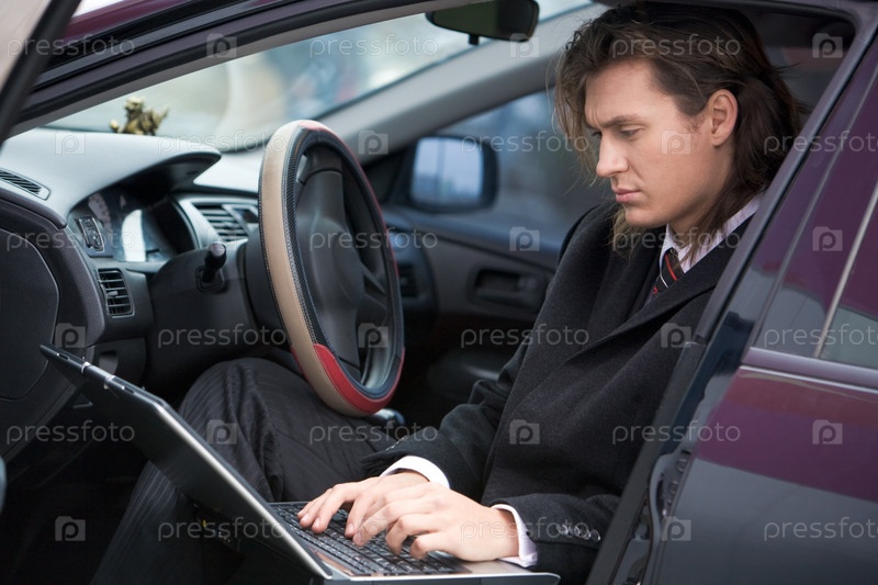 Фото занятого лидера, печатающего на ноутбуке с серьезным выражением лица в машине