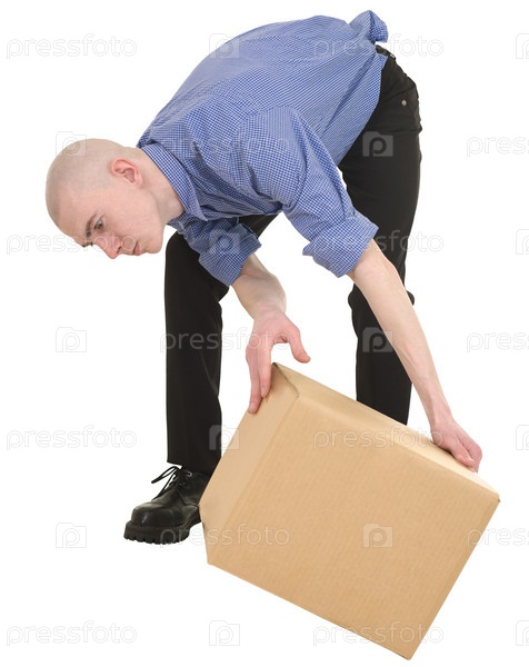 Мужчина смотрит под картонную коробку на белом