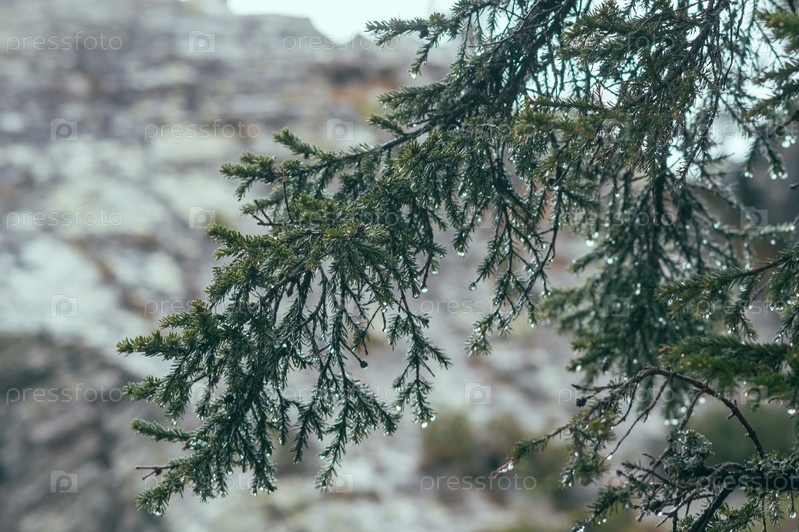 Капли дождя на концах веток пихты