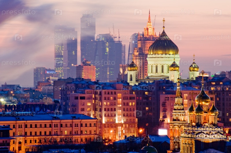 Храм Христа Спасителя и бизнес-центр вечером
