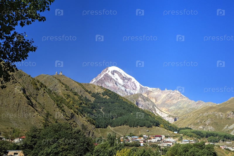Вид на гору Казбек и Монастырь Святой Троицы. Гергети, Грузия
