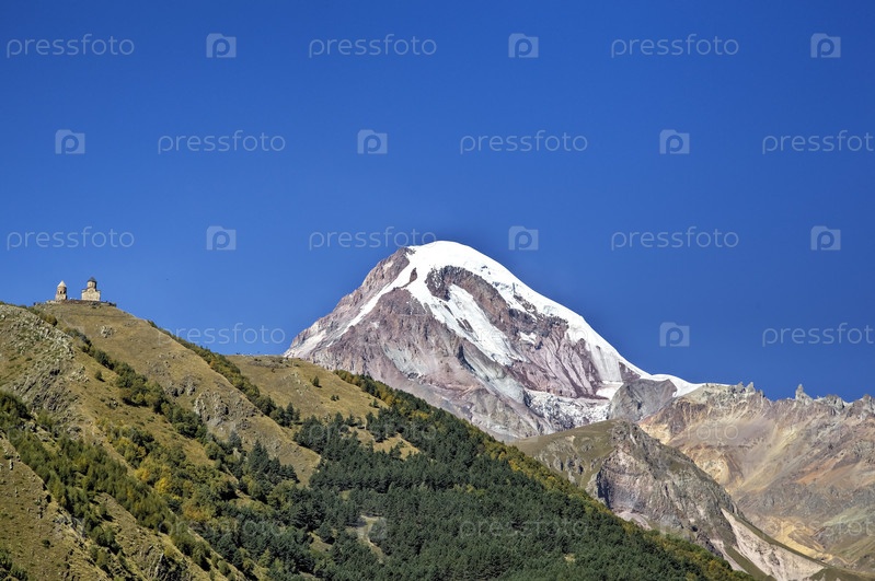 Вид на гору Казбек и Монастырь Святой Троицы. Гергети, Грузия
