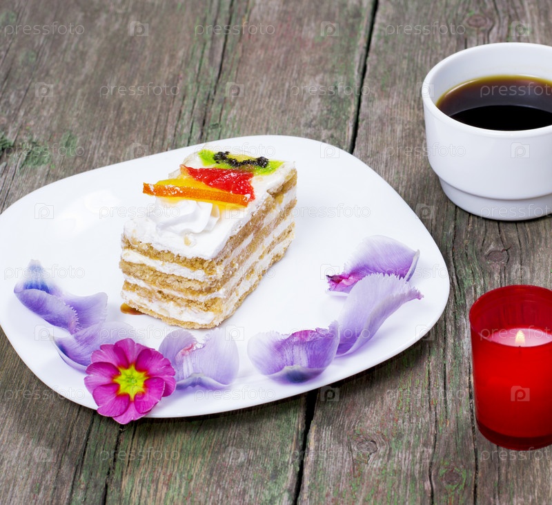 Кусочек вкусного торта и чашечка кофе