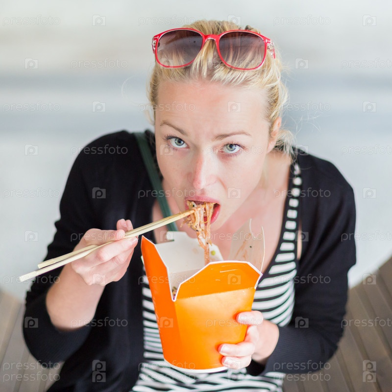 Девушка ест лапшу