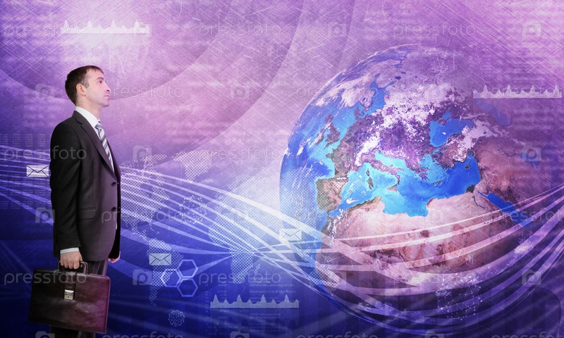 Бизнесмен перед картой мира