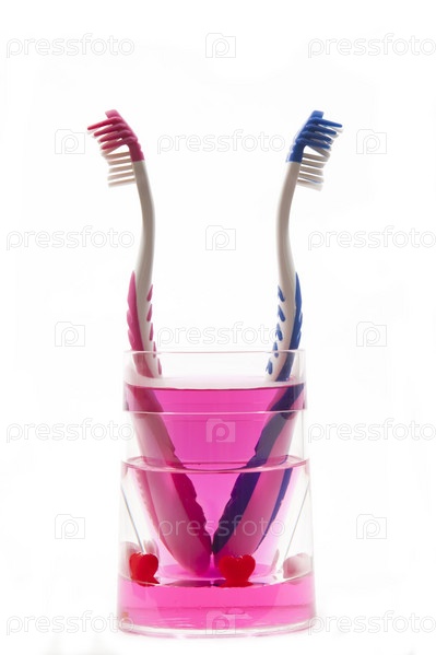 Зубные щетки в розовом стакане на белом фоне