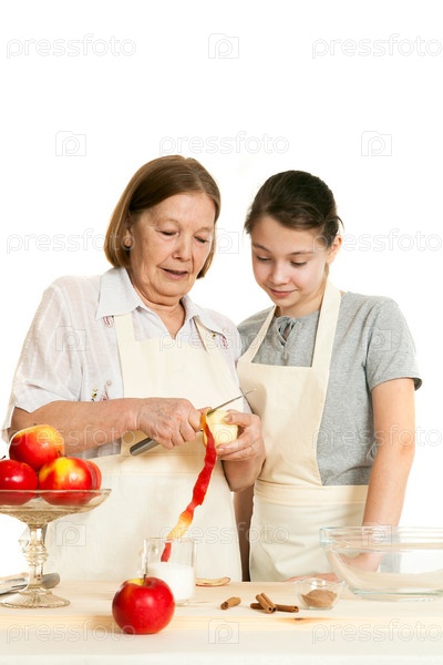 Бабушка учит внучку чистить яблоки