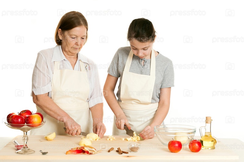 Бабушка учит внучку резать яблоки