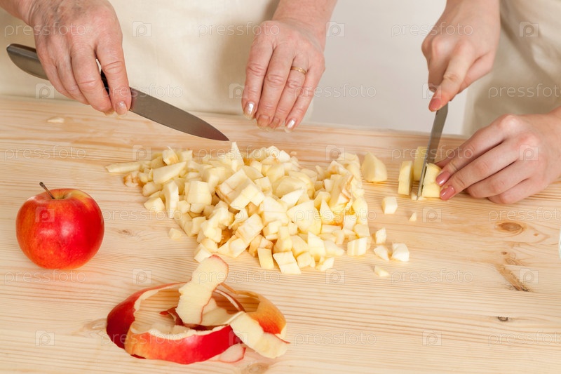 Бабушка и внучка режут яблоки