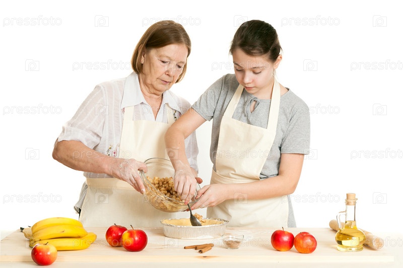 Бабушка и внучка укладывают начинку для пирога
