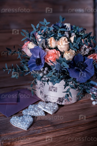 Красивый букет цветов и сердца