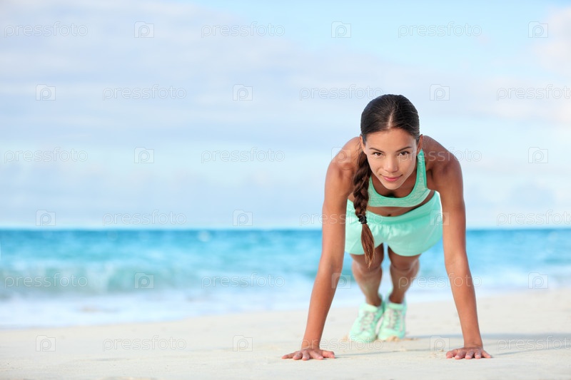 Девушка отжимается на пляже