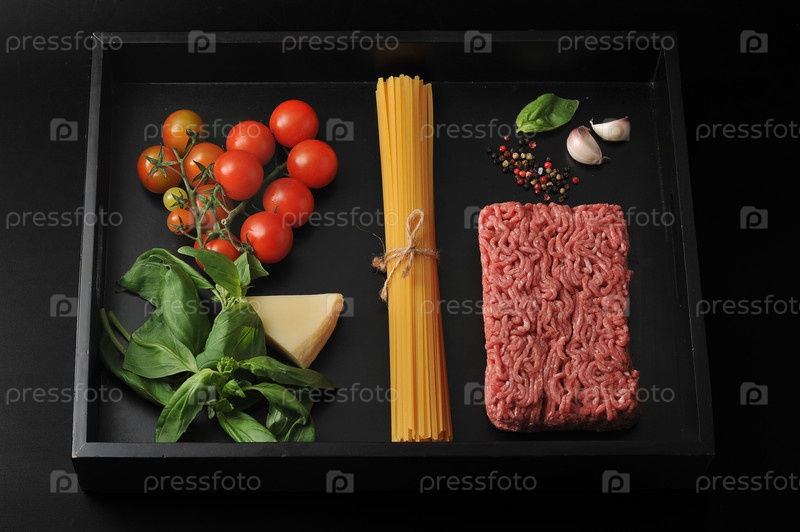 Набор продуктов для приготовления спагетти Болоньезесверху