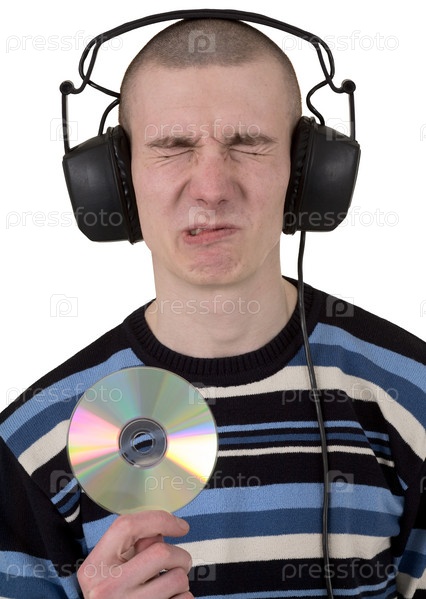 Молодой парень с наушниками на голове и компакт-диском в руке