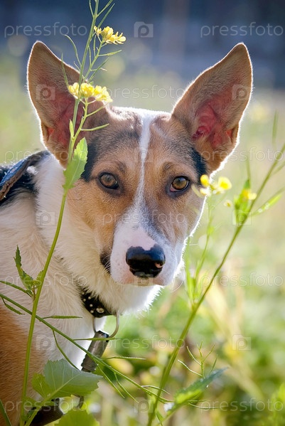 Собака на зеленом лугу